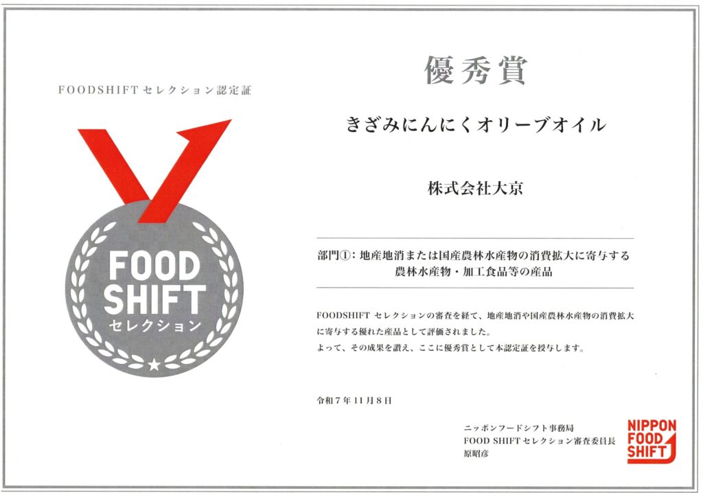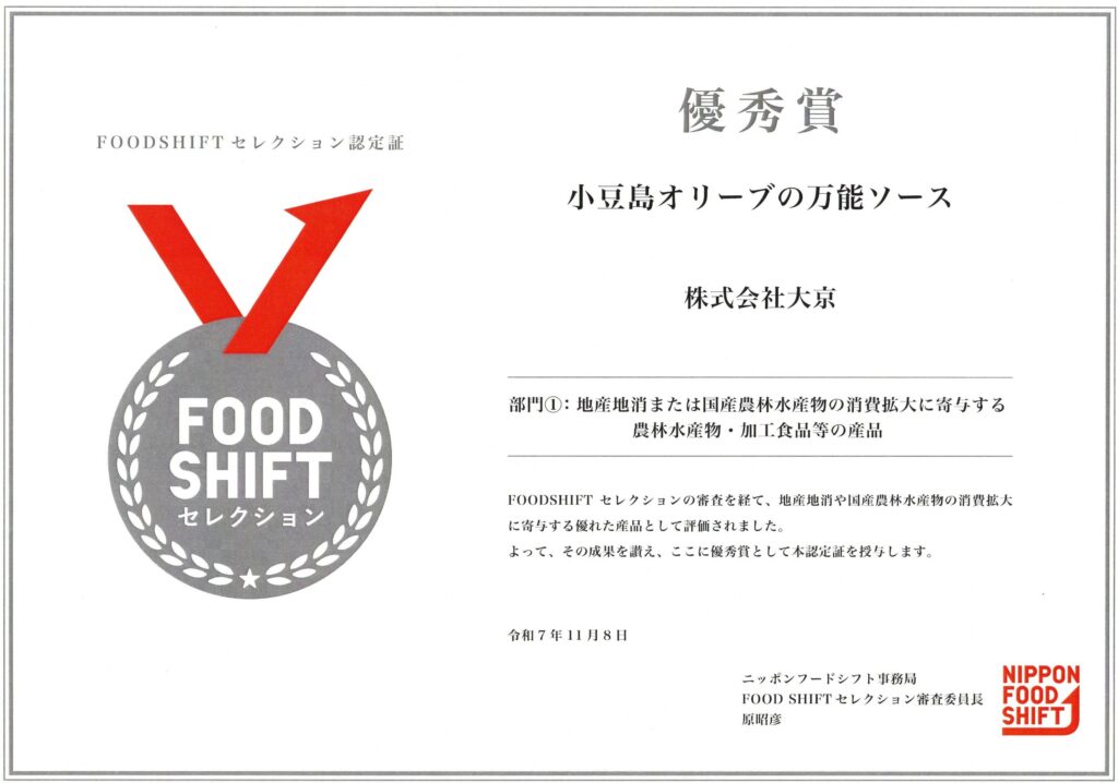 このたび、自然風土の「小豆島オリーブ万能ソース」と「きざみにんにくオリーブオイル」が、農林水産省が推進する「FOOD SHIFTセレクション」において、地産地消または国産農林水産物の消費拡大に寄与する産品部門 優秀賞 を受賞いたしました。日頃より自然風土の商品をご愛用いただき、支えてくださる皆さまに、心より御礼申し上げます。
